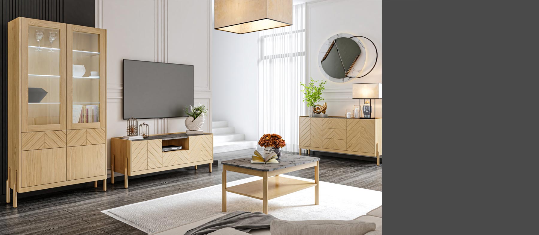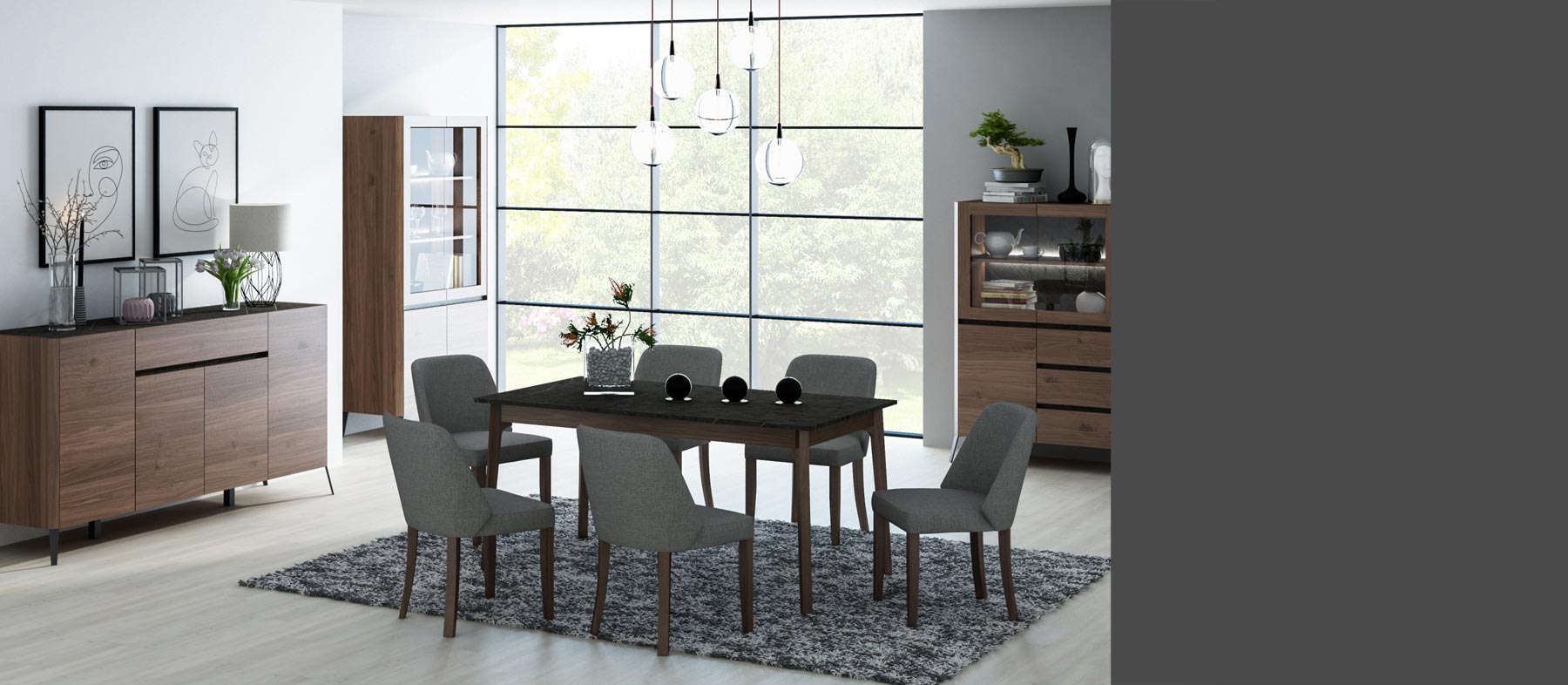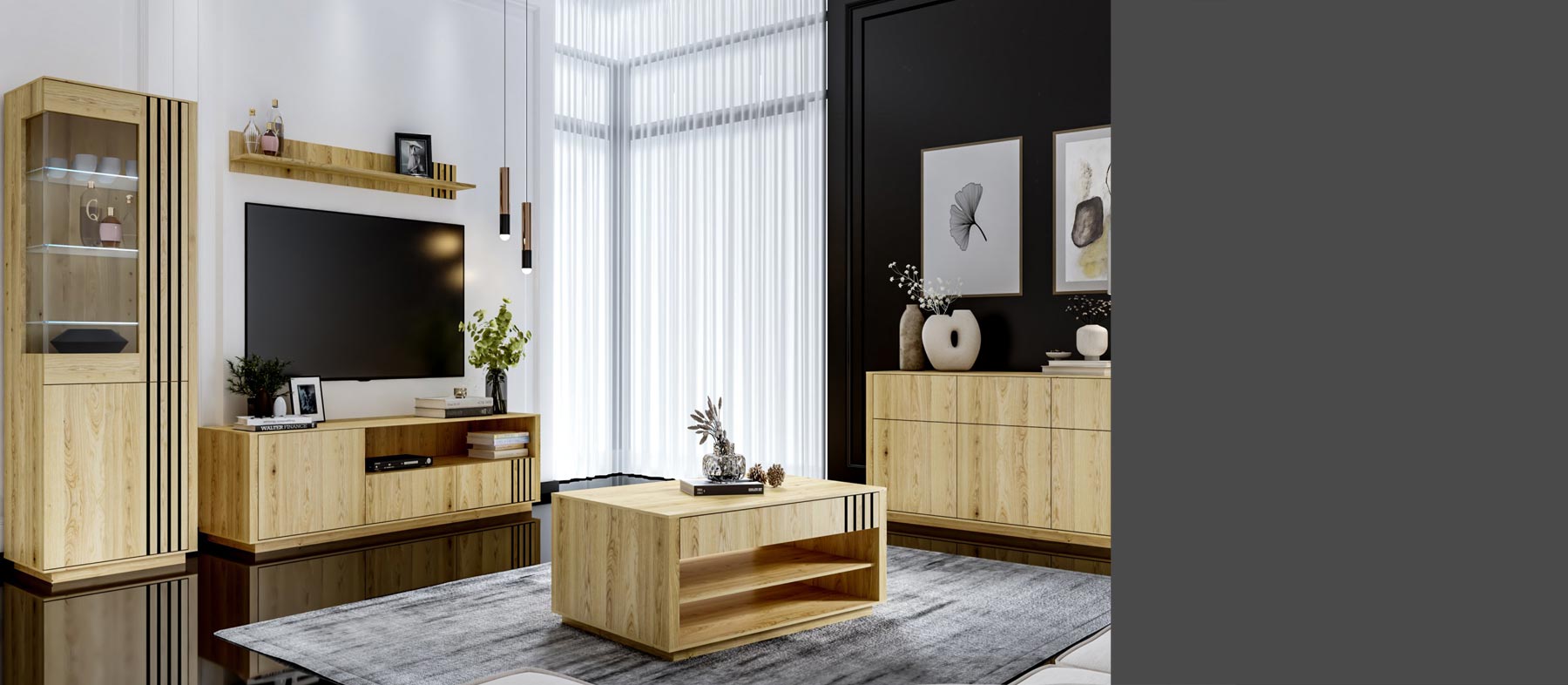 Ponadczasowa kolekcja z forniru dębowego w stylu nowoczesnej klasyki. Elegancki i inspirujący zestaw do jadalni i pokoju dziennego charakteryzujący się wyjątkową estetyką, a zarazem wygodą i praktycznością. Możliwość wyboru ciepłego koloru naturalnego dębu lub czarnego hebanu gwarantuje stworzenie przytulnego wnętrza, w którym zawsze poczujemy się dobrze, a funkcjonalność poszczególnych elementów zestawu sprosta wymaganiom najbardziej wymagających klientów.