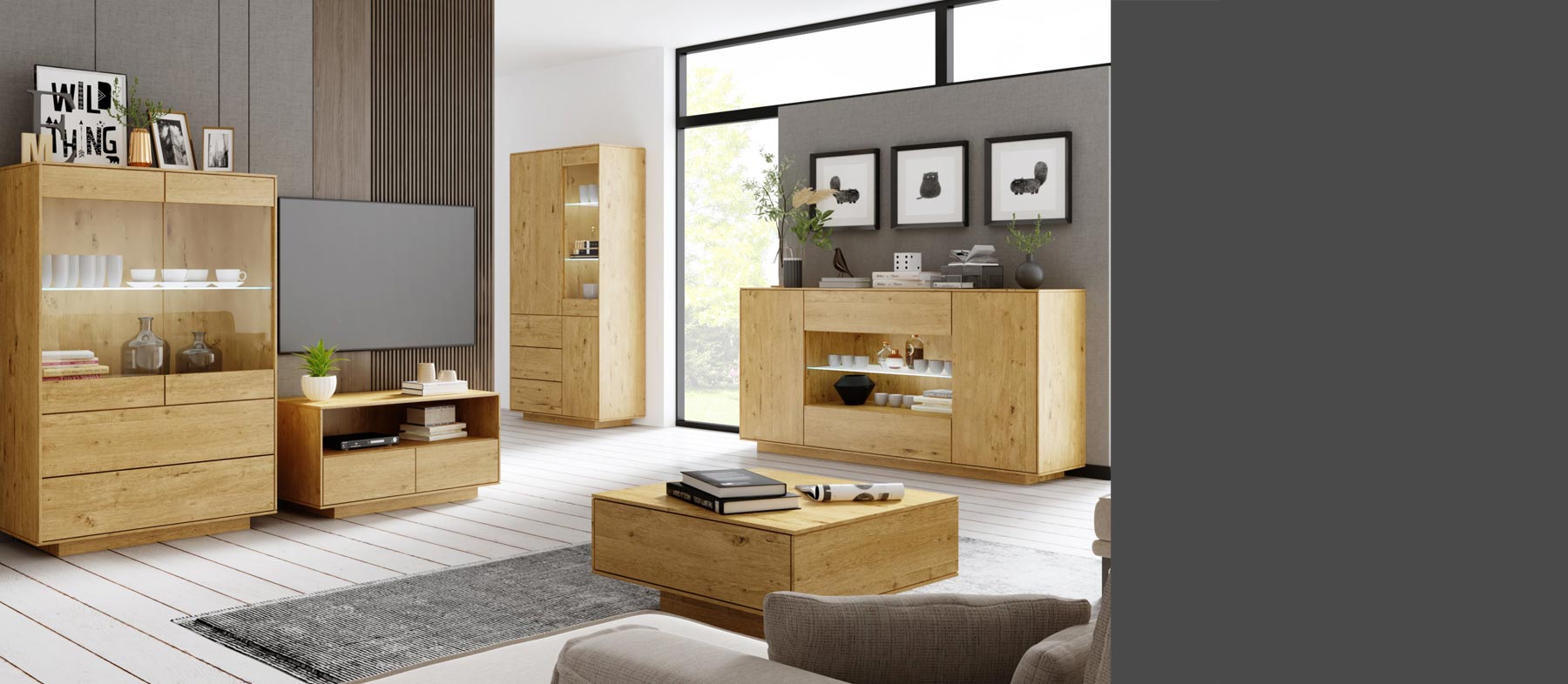 Ponadczasowa kolekcja z forniru dębowego w stylu nowoczesnej klasyki. Elegancki i inspirujący zestaw do jadalni i pokoju dziennego charakteryzujący się wyjątkową estetyką, a zarazem wygodą i praktycznością. Możliwość wyboru ciepłego koloru naturalnego dębu lub czarnego hebanu gwarantuje stworzenie przytulnego wnętrza, w którym zawsze poczujemy się dobrze, a funkcjonalność poszczególnych elementów zestawu sprosta wymaganiom najbardziej wymagających klientów.